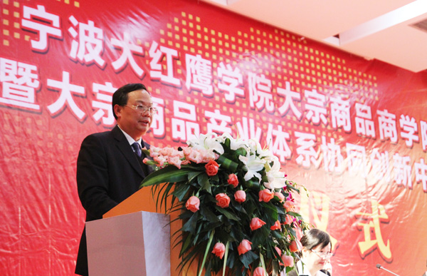 徐芳权董事长在致辞中强调,十一年前,宁波大红鹰教育集团以“不求任何经济回报,只求回报社会”为宗旨,创办了宁波大红鹰学院,并实现了从高职教育向本科教育的跨越。他指出,面向区域经济和社会发展需求,不断深化产学研相结合,在服务社会中推进教育教学改革与创新、形成办学特色、提升办学质量和水平,始终是学校的办学方向和目标。此次成立大宗商品商学院及组建协同创新中心,正是积极落实浙江和宁波海洋经济发展战略的具体表现,也是推进学校体制机制改革、人才培养模式改革、政产学研合作机制改革与创新的重要举措。他表示,在社会各界的大力支持和帮助下,大宗商品商学院和协同创新中心将努力为浙江省和宁波市海洋经济发展做出应有的贡献。
